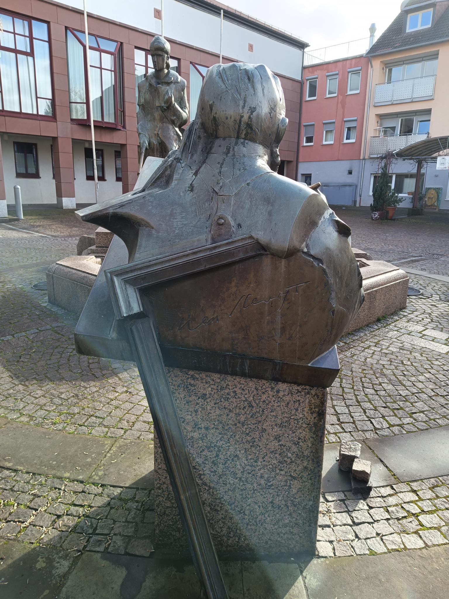 - Edenkoben: Lederstrumpfbrunnen: Darstellung des Max Slevogt, der bekannte Illustrationen zu einigen Ausgaben erstellte. Hier die Rückansicht mit Nachbildung seiner Signatur