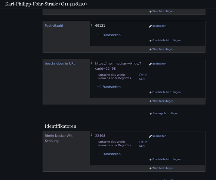- Bildschirmfoto des fertigen Eintrags bei Wikidata.org für die Verbindung mit dem Artikel Karl-Philipp-Fohr-Straße im Rhein-Neckar-Wiki