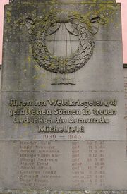 | 19:04, 11. Mär. 2012 | Gefallenendenkmal Michelfeld 4.JPG (Datei) | 229 KB | Suggs | {{Bildbeschreibung|Angelbachtal - Michelfeld: Gefallewnendenkmal für die Opfer beider Weltkriege, Vorderseite der Stele | selbst | S. Zimmermann | 10.03.2012 | }} Kategorie:Bild (Suggs) Kategorie:Bild (Angelbachtal)] [[Kategorie:Bild (Gefall | 1 | |