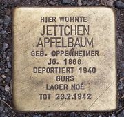 | 22:17, 15. Mär. 2012 | Stolperstein Jettchen Apfelbaum.JPG (Datei) | 266 KB | Suggs | {{Bildbeschreibung| Hemsbach: Stolperstein gegenüber dem Haus Bachstraße 54, Jettchen Apfelbaum | selbst | S. Zimmermann | 12.03.2012 | }} Kategorie:Bild (Suggs) Kategorie:Bild (Hemsbach) Kategorie:Bild (Stolperstein) == Lizenz == { | 1 | |