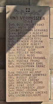| 22:09, 23. Mär. 2012 | Gefallenendenkmal Rettigheim.JPG (Datei) | 1,39 MB | Suggs | {{Bildbeschreibung|Rettigheim: [[Gefallenendenkmal] für die Opfer beider Weltkriege auf dem Friedhof | selbst | S. Zimmermann | 14.03.2012 }} Kategorie:Bild (Suggs) Kategorie:Bild (Rettigheim) Kategorie:Bild (Gefallenendenkmal) == L | 1 | |