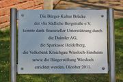 | 21:06, 20. Jan. 2014 | Wiesloch-Gerbersruhpark-06.jpg (Datei) | 170 KB | {{Bildbeschreibung|Gerbersruhpark in Wiesloch – Schild zur Bürger-Kultur Brücke | Selbst fotografiert | Manfred Hattenkerl | 27.07.2012 | Auf Anfrage (120725-Wies 020) | {{CC-by-nc-sa-2.5}} }} Kategorie:Bild (FamHaPo) [[Kategorie:Bild (Ger… | 1 | |