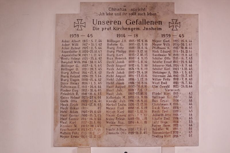 - Protestantische Kirche Insheim, Gedenktafel für die Gefallenen Insheimer beider Weltkriege