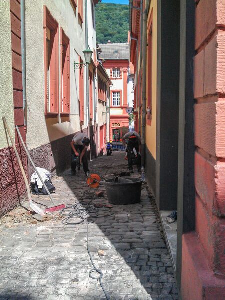 - 2013 wurden das Pflaster in der Altstadt erneuert. Das Bild zeigt die Arbeiten im Küchengässchen.