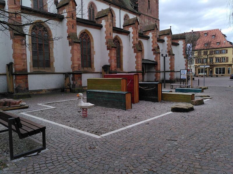 - Der Johannes-Bader-Platz in Landau. Im Hintergrund die Stiftskirche Landau