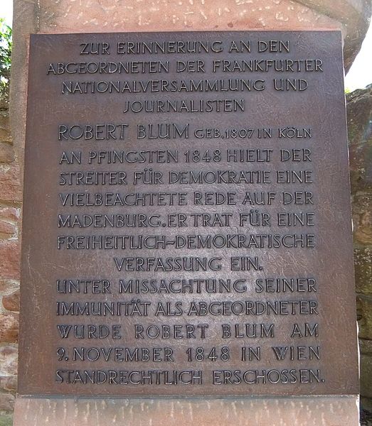 - Madenburg:Inschrift des Gedenksteins für den Paulskirchenabgeordneten Robert Blum, der 1848 auf der Madenburg eine wichtige Rede hielt.
