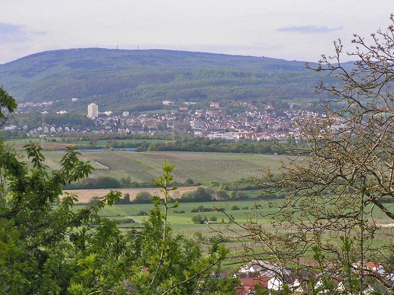 - Blick vom Letzenberg über Malschenberg hinweg nach Wiesloch. Im Hintergrund der 567,8 m hohe Königsstuhl.