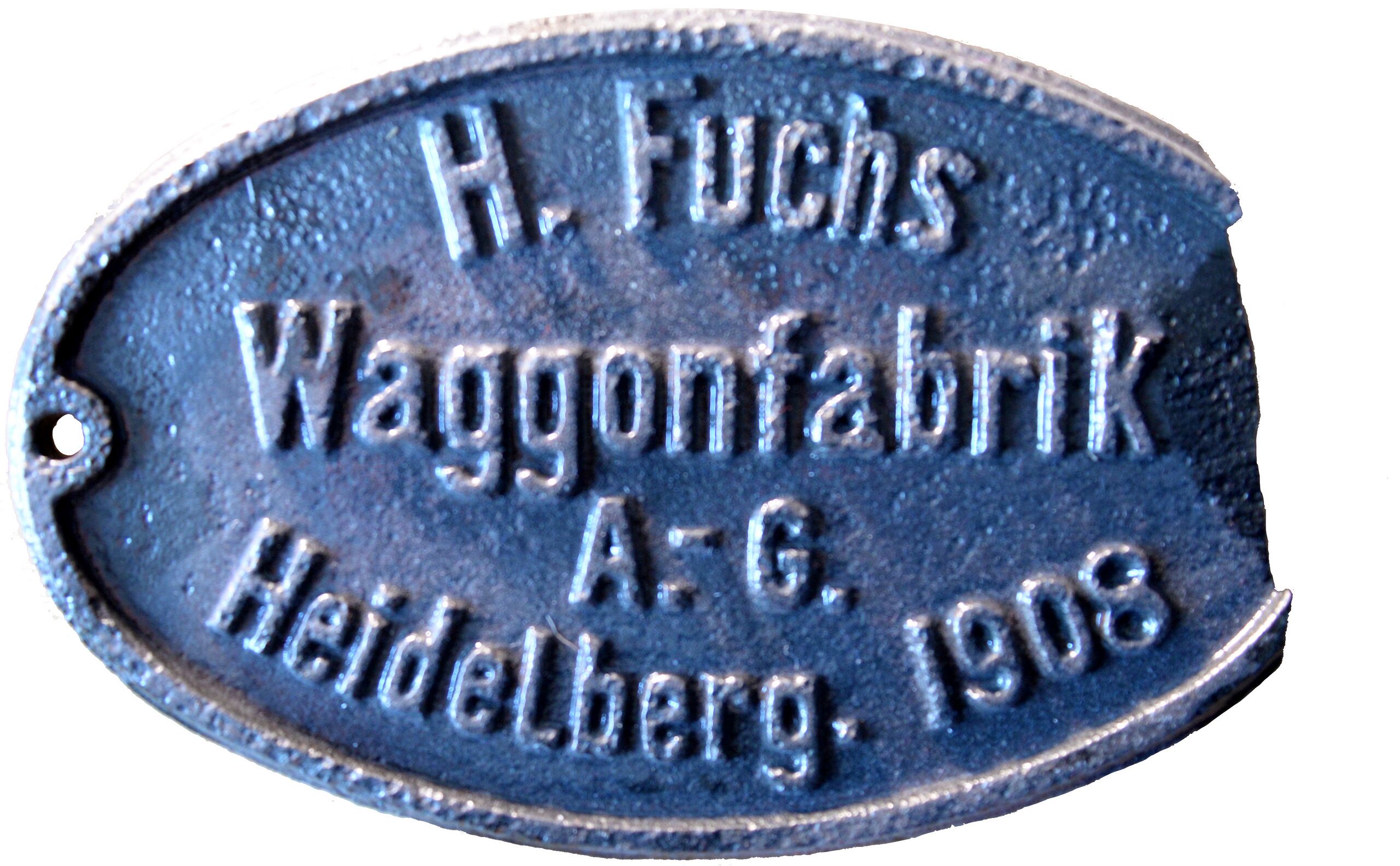 - Fotografie eines Waggonschildes der Waggonfabrik Fuchs: H. Fuchs Waggonfabrik A.-G. Heidelberg. 1908
