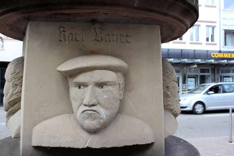 - Sinsheim – Hauptstraße. Porträt von Karl Bauer an der Freiheitssäule (1998) von Hans Michael Franke.