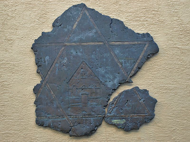 - Wiesloch Synagogengasse – Hier war der Standort der1957 abgerissenen ehemaligen Synagoge. Gedenktafel „Reichskristallnacht“ (1988) aus Bronze von Karel Fron.