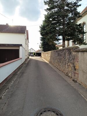 Hinter der Kirche verbindet ein Fußweg die beiden Sackgassenteile.