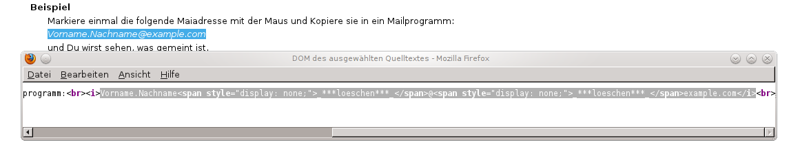 | 22:36, 29. Jan. 2011 | E-Mailadresse Verschleiern mit CSS 01.png (Datei) | 26 KB | {{Bildbeschreibung|E-Mailadresse verschleiern mit CSS, Darstellung im Wiki und als HTML Code | Screenshot mit Firefox 3.5 | ~~~ | 2011-01-29 | - }} | 1 | |