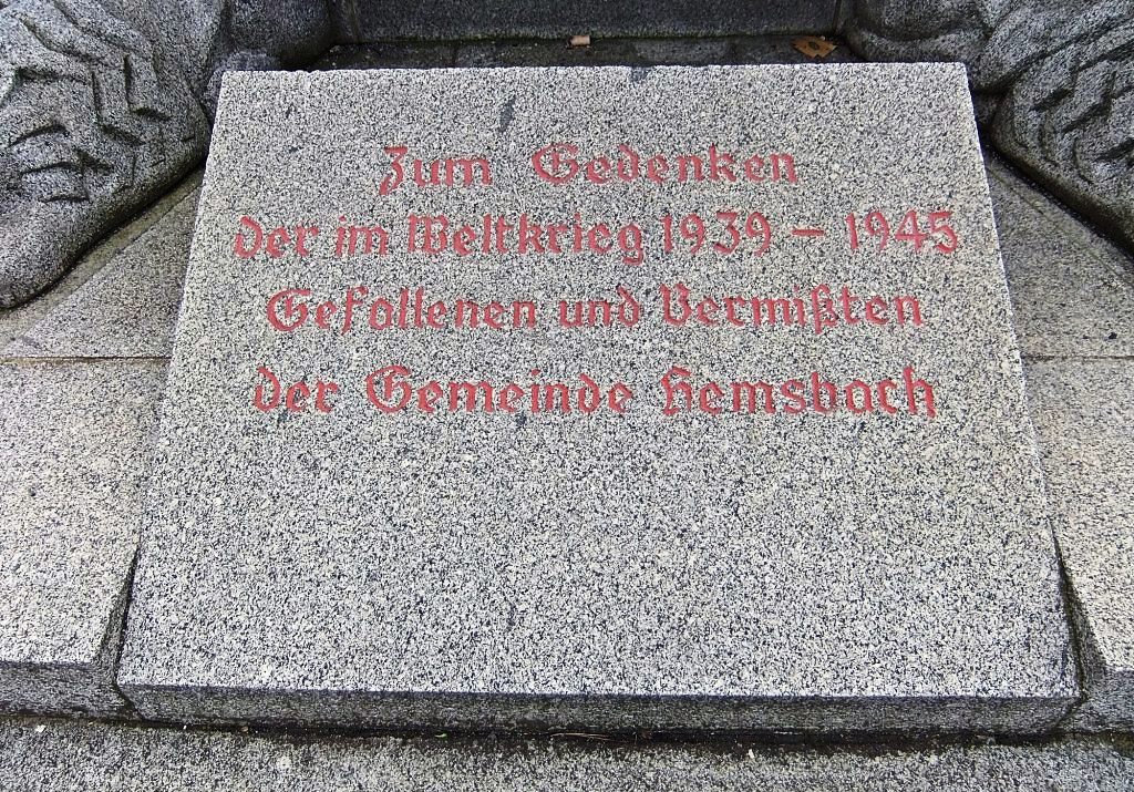 Hemsbach: Gefallenendenkmal für die Opfer des Ersten Weltkrieges in Form eines Brunnens vor dem Hemsbacher Rathaus. Hier: Eine Zusatztafel die an die Gefallenen des Zweiten Weltkrieges erinnert