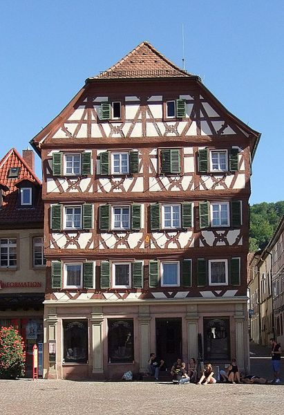 Mosbach Haus Lindenlaub. 1569 erbaut, wurde es 1869 aus Feuerversicherungsgründen verputzt. zu jener Zeit befand sich ein Uhrmachergeschäft im untersten Stockwerk. Um 1900 wurde der Putz wieder entfernt und das Fachwerk freigelegt.