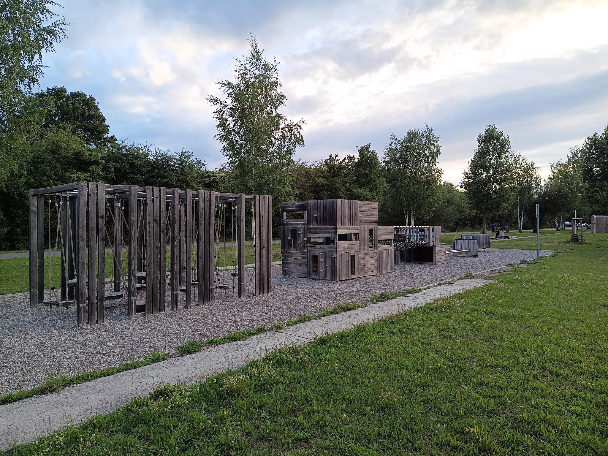 - Landesgartenschau Landau / Spiel und Sportcampus "Am Ebenberg": Kletterstapel/Spielschuppen. Zustand im Jahr 2023.