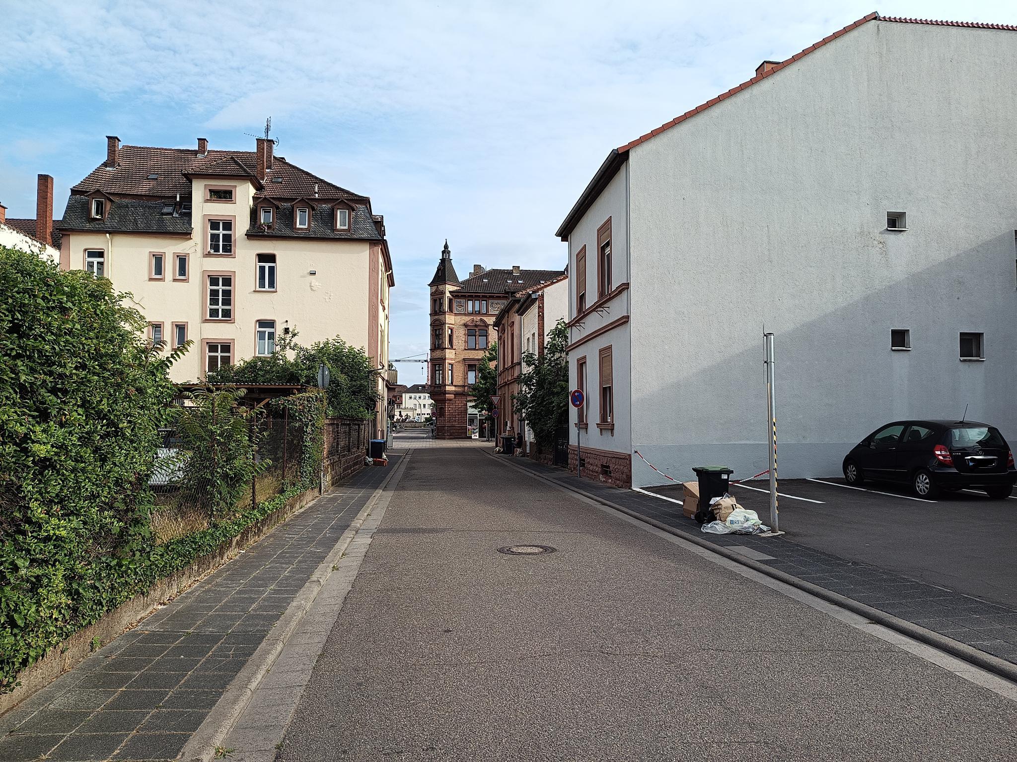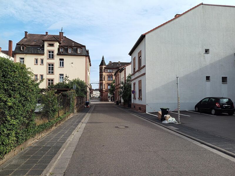 Landwehrstraße (Landau) im nördlichen Abschnitt, mit Blick nach Süden auf die Ostbahnstraße (Landau) und dahinter der südliche Landwehrstraßenabschnitt. Das weiße Gebäude im Hintergrund gehört zur Poststraße (Landau)