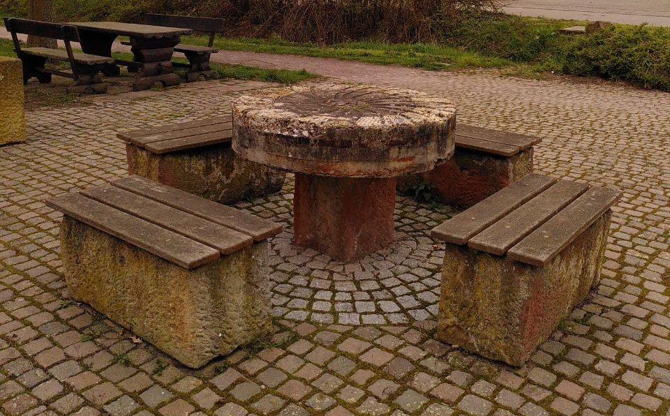- Mörlheim : Zum Tisch umfunktionierter ehemaliger Mühlstein auf Platz Ecke Mörlheimer Hauptstraße /An den Thoräckern. Erbesteht aus Hartsandstein aus Nordfrankreich und wurde, als er noch in Betrieb war, als Bodenstein verwendet.