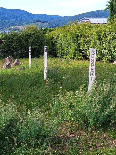 - Birkweiler: Stelen auf dem Picknickplatz im Südosten des Dorfs