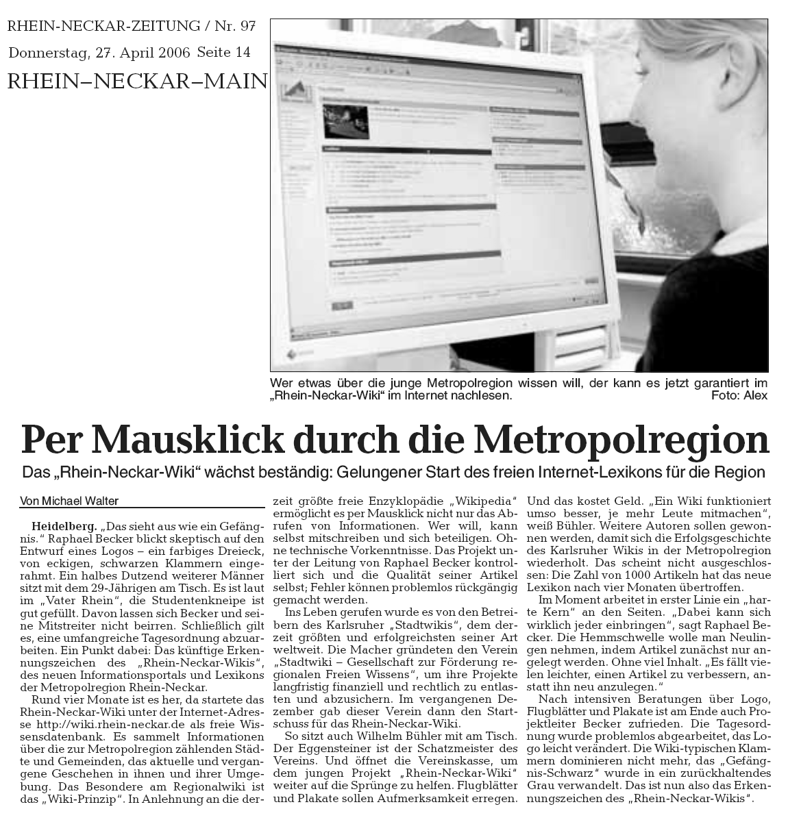 Dieses Bild ist ein Zusammenschnitt des am 27. April 2006 in der Rhein Neckar Zeitung erschienen Presseberichts über den Start des Rhein-Neckar-Wikis.