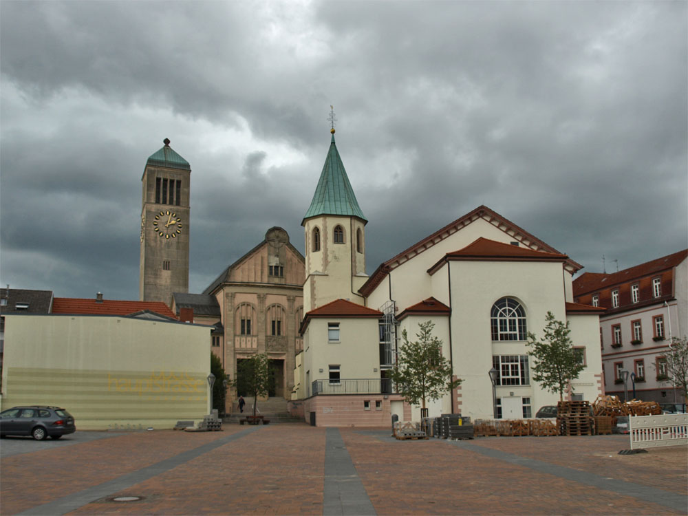 - Hockenheim – Blick vom Parkplatz zum Turm von St. Georg (links) und rechts der Turm der Festhalle, die ehemalige Kirche St. Christoporus.