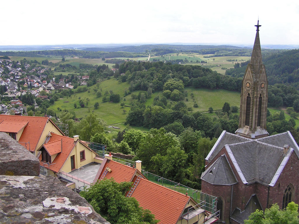 - Bergfeste Dilsberg – Blick vom Mauergang auf die evang. Kirche und den Kraichgau.