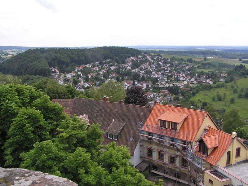 - Bergfeste Dilsberg – Blick vom Mauergang zum Ortsteil Dilsberg-Neuhof.