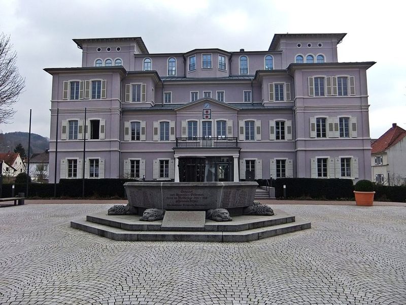 - Hemsbach: Das ehemalige Rothschild-Schloss, dient der Gemeinde heute als Rathaus. im Vordergrund noch das Gefallenendenkmal für die Opfer des ersten Weltkrieges