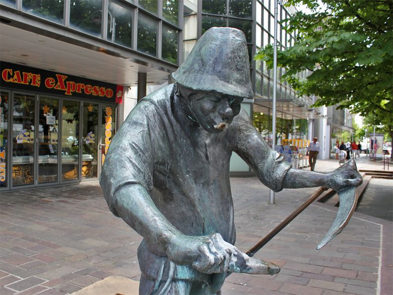 - Sinsheim – Am Karlsplatz. Brunnen und Plastiken „Sinsheimer Wetzstoispucker” (1989) aus Bronze von Renate Jung.