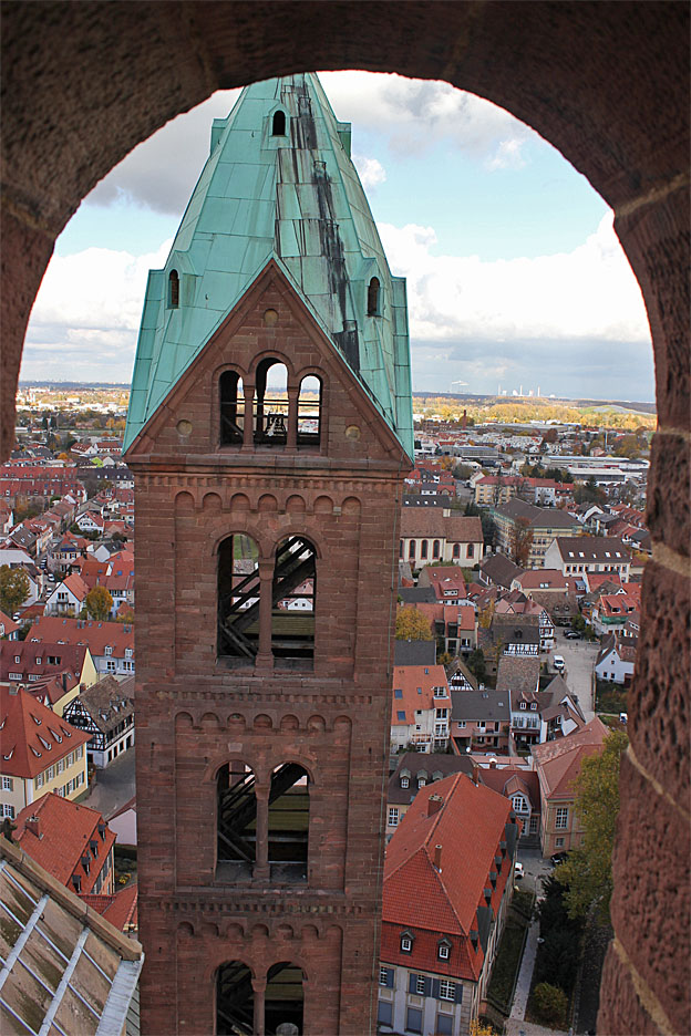 Kaiserdom in Speyer – Blick vom Südwest-Turm zum Nordwest-Turm. Rechts im Hintergrund das Großkraftwerk Mannheim.