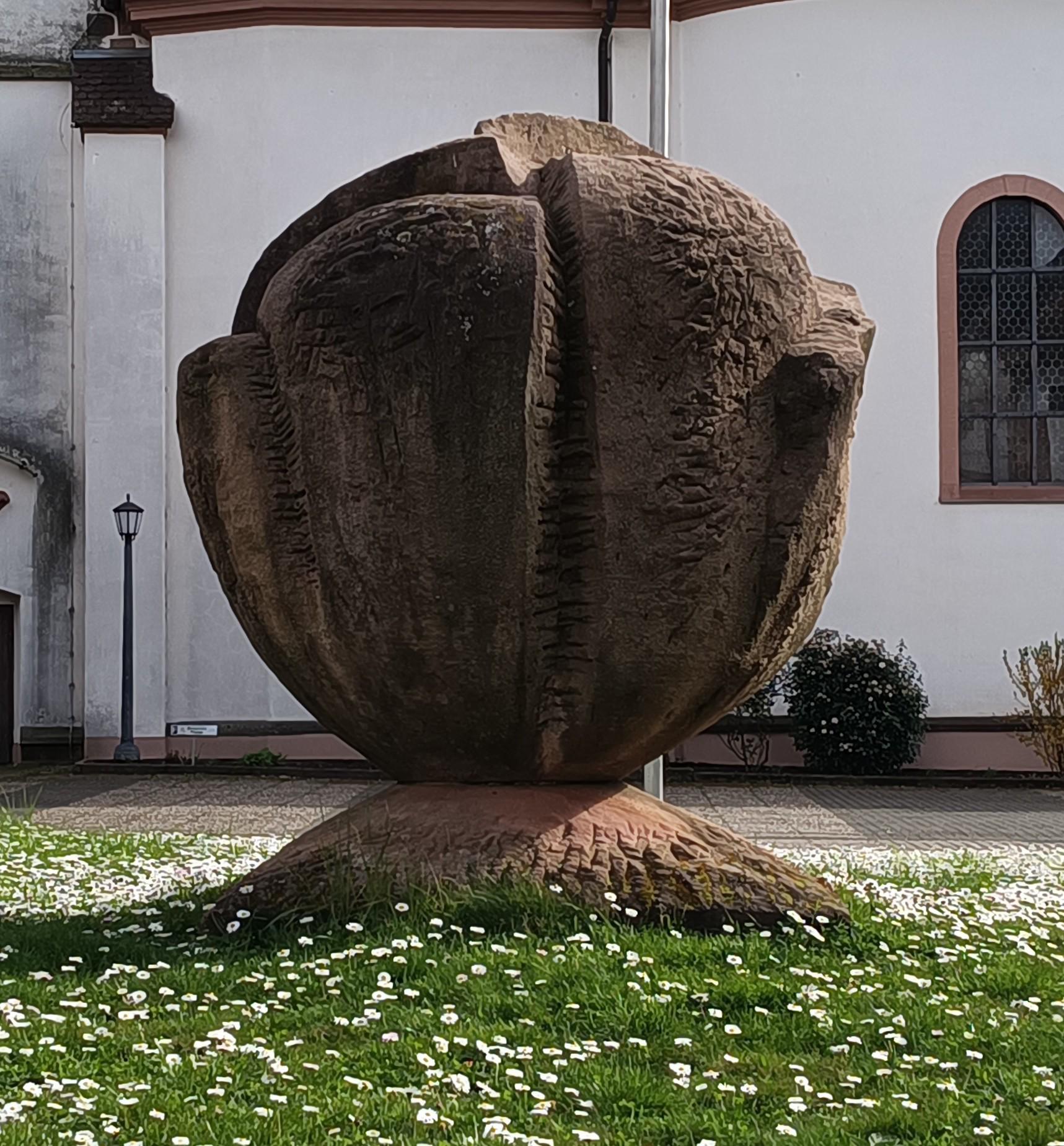 - Dalbergstraße (Venningen): Kunstwerk "Knospe", von Wieslaw Pietron aus dem Jahr 1995. Im Hintergrund die Kirche St. Georg Venningen