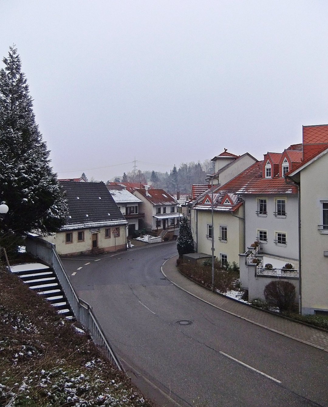 - Baiertal: Wieslocher Straße von der katholischen Kirche aus gesehen, Blick Richtung Norden mit der scharfen Kurve die die Straße nach Osten führt