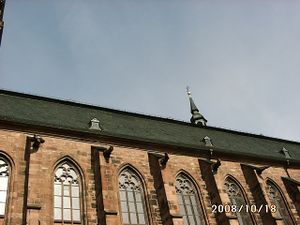 Um die Kirche bestehen noch heute eine Reihe von Kramerläden zwischen den Wandstützpfeilern. Die steinernen Wasserspeier verkörpern Teufel und Fabeltiere. Auf dem Schiff sitzt noch ein kleiner Dachreiter mit Doppelkreuz und einer Glocke von 1712.