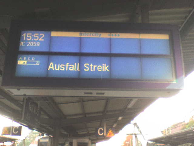 | 21:33, 1. Feb. 2008 | Bahn Anzeigetafel Streik.jpg (Datei) | 27 KB | {{Bildbeschreibung|Anzeigetafel beim Lokführer-Streik|selbst fotografiert|Benutzer:Jan.ndl|15.11.2007|keine}} {{DB-Lizenz}} | 1 | |