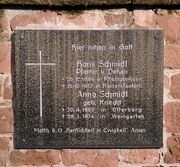 | 17:01, 31. Okt. 2021 | Hans Schmidt Grabstein.jpg (Datei) | 455 KB | == Beschreibung == {{Bildbeschreibung| Grabstein von Pfarrer Hans Schmidt an der Mauer des Rheingönheimer Friedhofs |Benutzer:Rübenbrei | 20.2.2021 | }} == Lizenz == {{CC-by-nc-sa-2.5}} Kategorie:Bild (Rheingönheim) | 1 | |
