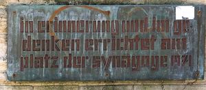 Umrandet von einer Begrünung und einem Tor aus dem ein Davidstern herausgebrochen ist, befinden sich im Rechten Winkel zueinander zwei Mauern. Die größere Mauer trägt eine Tafel mit der Inschrift "Zum Gedenken und zur Erinnerung an die jüdischen Mitbürger errichtet am Platz der Synagoge".