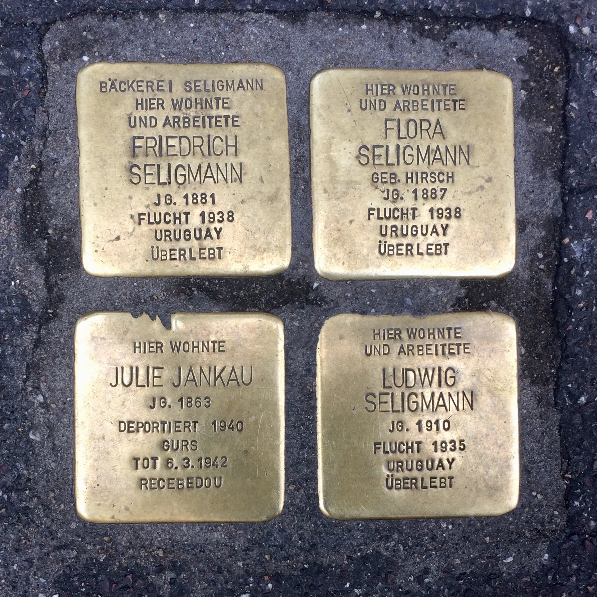 | 10:00, 10. Okt. 2018 | Stolpersteine Ploeck 34 Heidelberg.jpg (Datei) | 3,3 MB | {{Bildbeschreibung|Stolpersteine vor der Plöck (Heidelberg) in Heidelberg: Familie Seligmann (Friedrich Seligmann, Flora Seligmann, Ludwig Seligmann), Julie Jankau. Verlegt am 16.03.2013 | Eigene Aufnahme | Adrian Yass | 01.09.2018 }} [[Kategori… | 1 | |