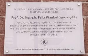 ;1:[[ | [[Datei:Felix Wankel Gedenktafel Heidelberg.jpg|thumb|Die Gedenktafel]] | ||