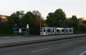 [[Datei:Freiburger Str.jpg|miniatur|Haltestelle Freiburger Str. mit MGT6D]] | [[Datei:Freiburger Str.jpg|miniatur|Haltestelle Freiburger Str. mit MGT6D]] | ||