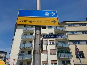 Straßenschild Akademiestraße mit Wegweiser zur Autobahn und Bundesstraße 44