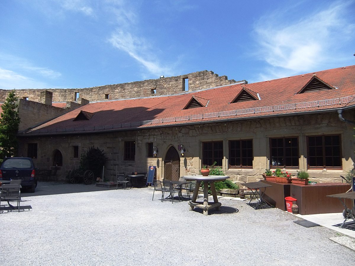 - Burg Steinsberg: Wirtschaftsgebäude mit Eingang zum Restaurant