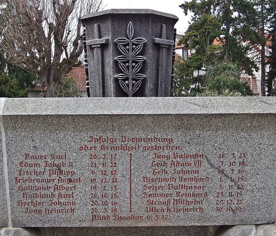 - Hemsbach: Gefallenendenkmal für die Opfer des Ersten Weltkrieges in Form eines Brunnens vor dem Hemsbacher Rathaus. Hier: Inschrift auf dem Brunnentrog mit den Namen von In Folge Verfundung oder Krankheit verstorbener Kriegsteilnehmer